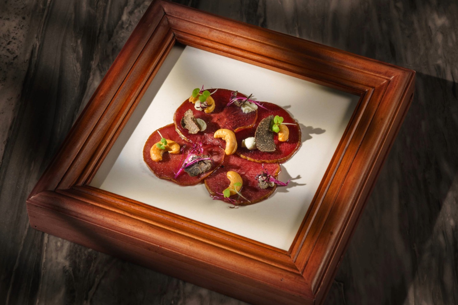 Thinly sliced wine-marinated pear is paired with truffle honey, fresh black truffle, and airy gorgonzola mousse. The contrast of sweet, salty, and earthy flavors meets in a point of absolute harmony.