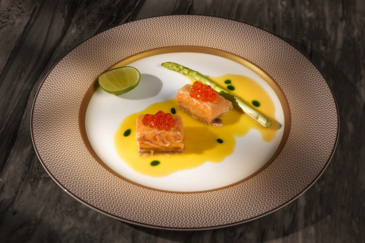 Sous-vide salmon, red caviar, classic beurre blanc with white wine and shallots, asparagus, and citrus zest — an elegant, fresh, and perfectly balanced classic.